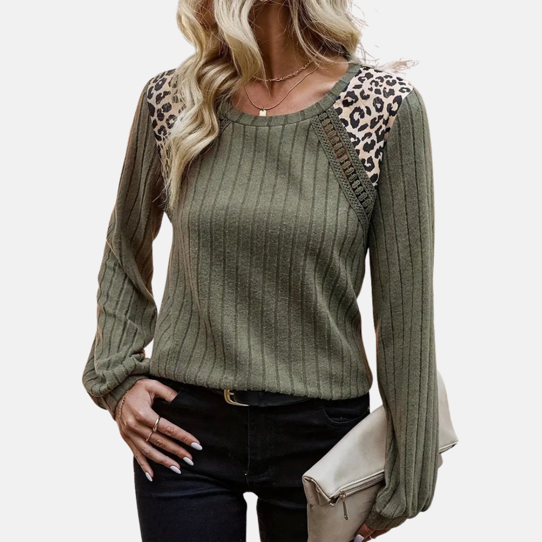 Strickpullover für Herbst & Winter - Rippstrick Sweater mit Leoparden-Details und Rundhals für Damen